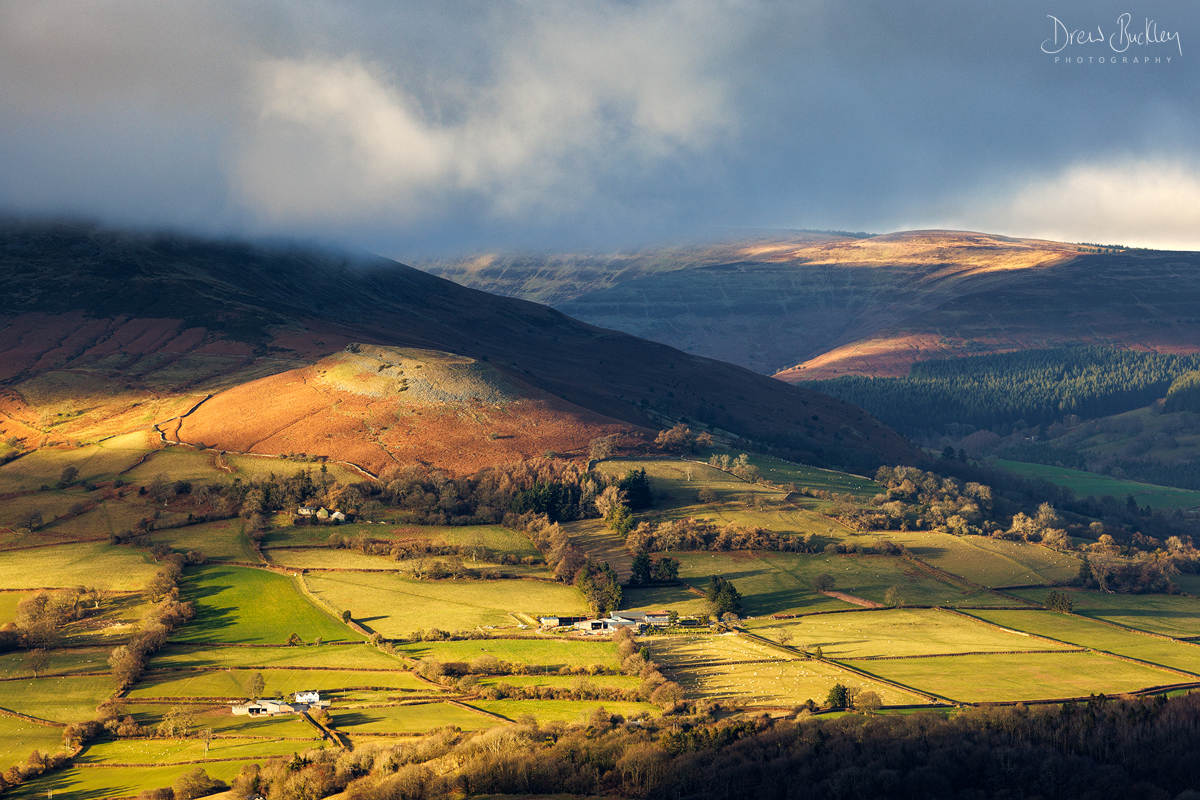 Afternoon light illuminates the hills and Crug Hwyel above Crickhowell – Brecon Beacons National Park, Wales, UK